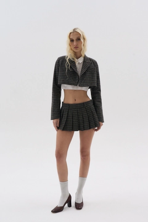 Blazer crop confeccionado en paño cuadrillé. Forrería interna. Hombreras de 2cm. Esta prenda hace conjunto con la Espresso Miniskirt y el Espresso Pant.