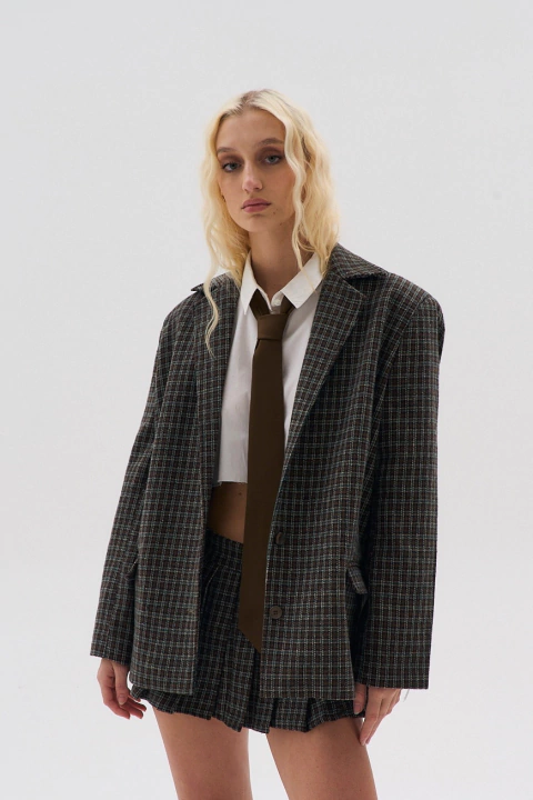 Blazer oversize confeccionado en paño cuadrillé. Forrería interna. Hombreras de 3cm. Botones y bolsillos delanteros. Esta prenda hace conjunto con la Espresso Miniskirt y el Espresso Pant.